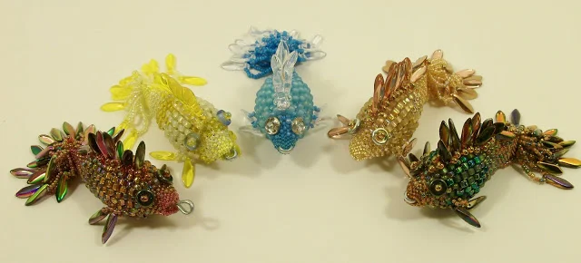 While wandering through the Gathering Place at the Bead&Button show I met Ralonda Patterson who was stitching art dolls. Then I noticed these amazing fish she had designed. I was hooked. I rarely buy kits but I just had to have one. Talk about texture, I loved the little dagger fins and tails. She captured fish scales with her beads and sculpted the fish by varying the size of her beads. Check out Ralonda's Blog.