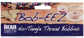Made of flexible plastic, these handy thread bobbins allows you to flip open the bobbin and wind string or ribbon on to the spool. Flip the plastic back down over the thread after you have wound it around the bobbin. The locking feature prevents threads from unraveling and tangling. The bobbins are stackable and will snap together for easy storage. For my tool bag and travel kit, I transfer an assortment of Fireline sizes and colors (4, 6, 8 and 10 in crystal and smoke) and label them. That way I always have whatever I need without those cumbersome spools.